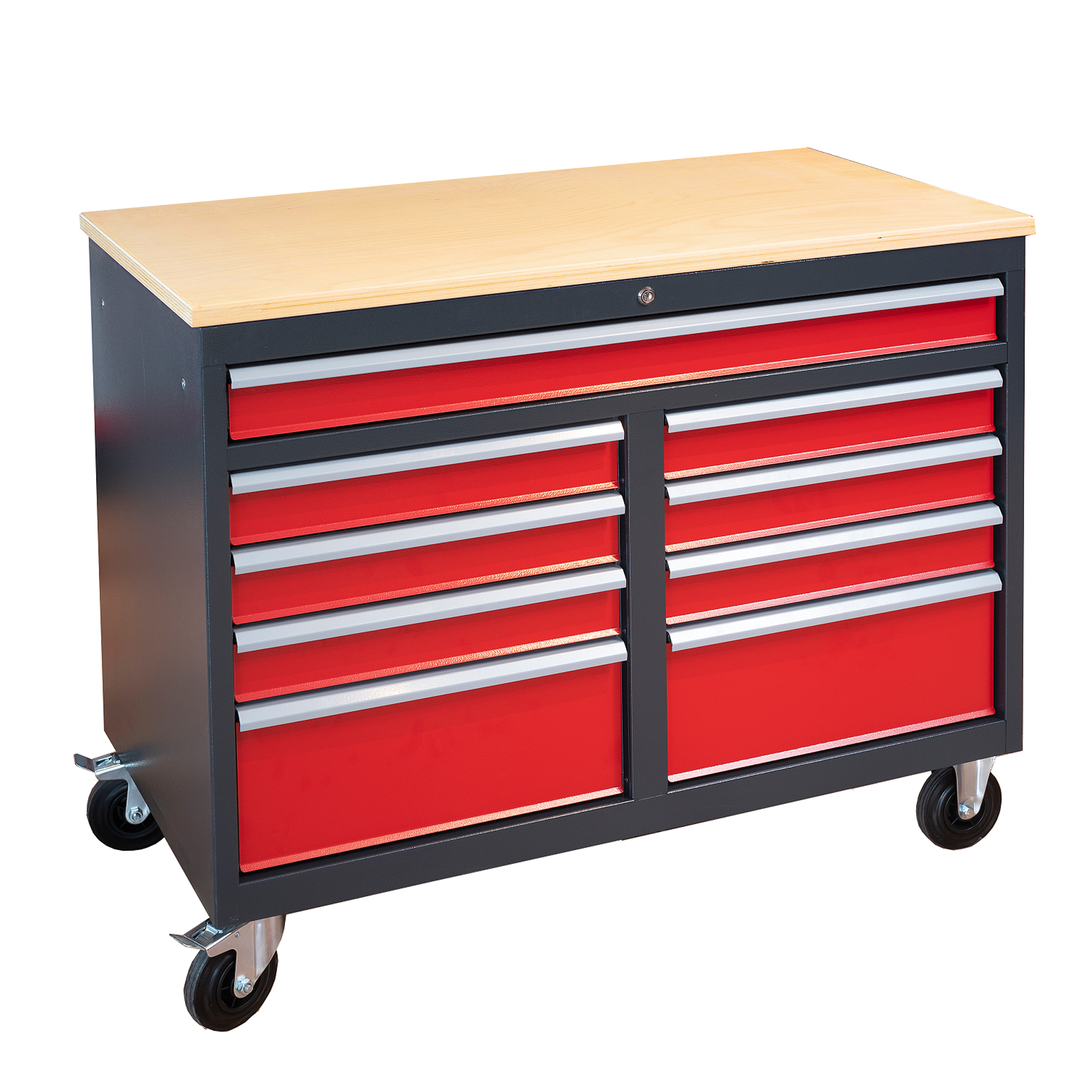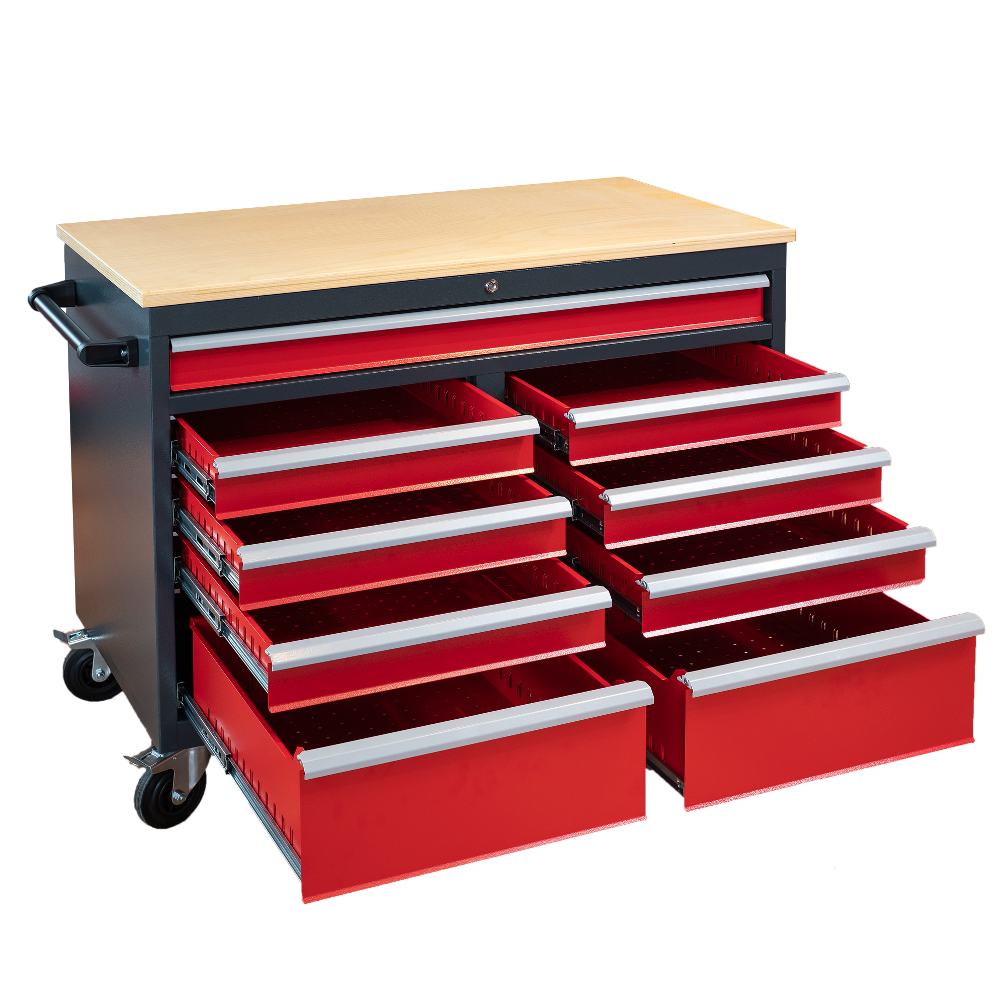 - Kovový dielenský pracovný stôl so zásuvkami na kolieskach DANIEL, RAL 7016/3000/7001