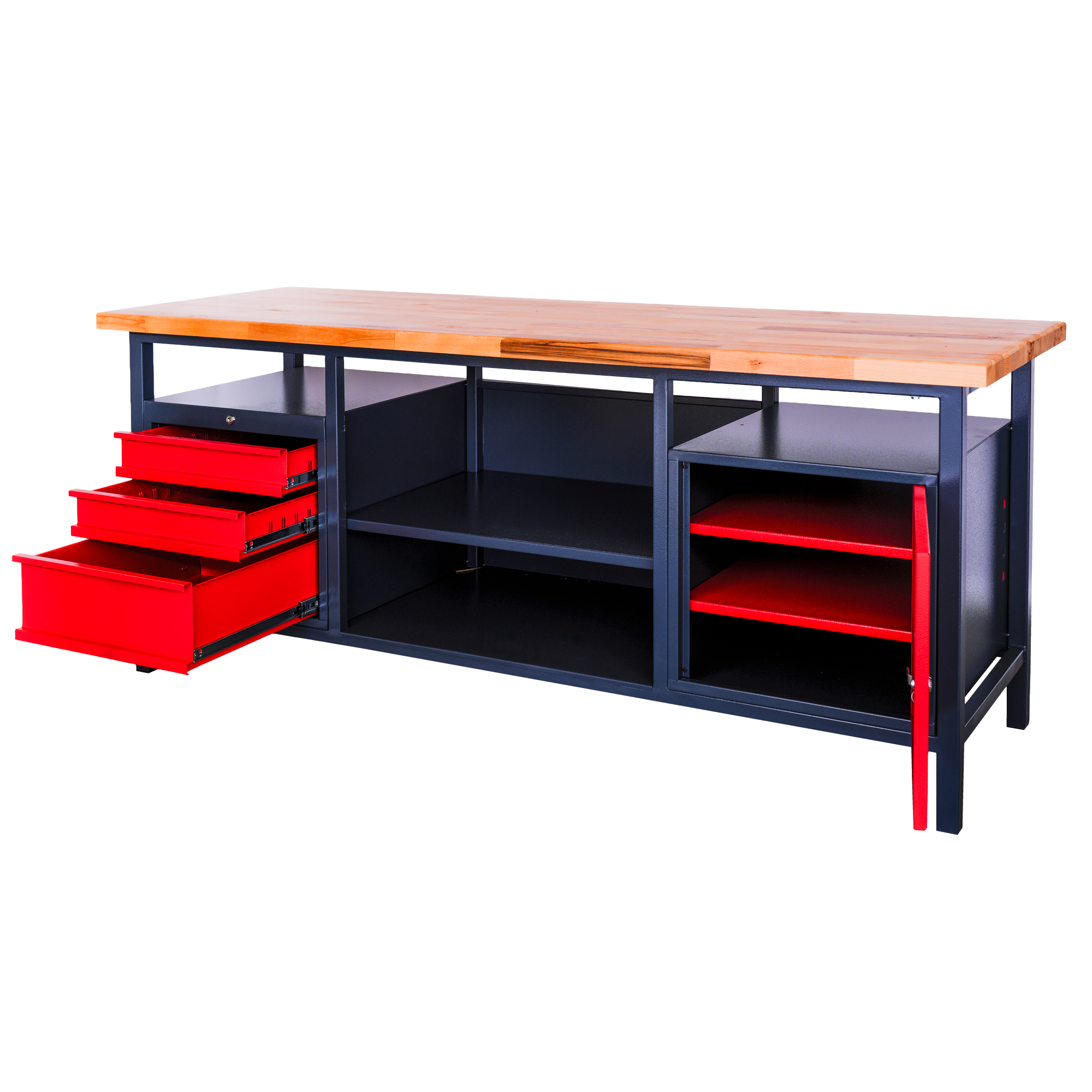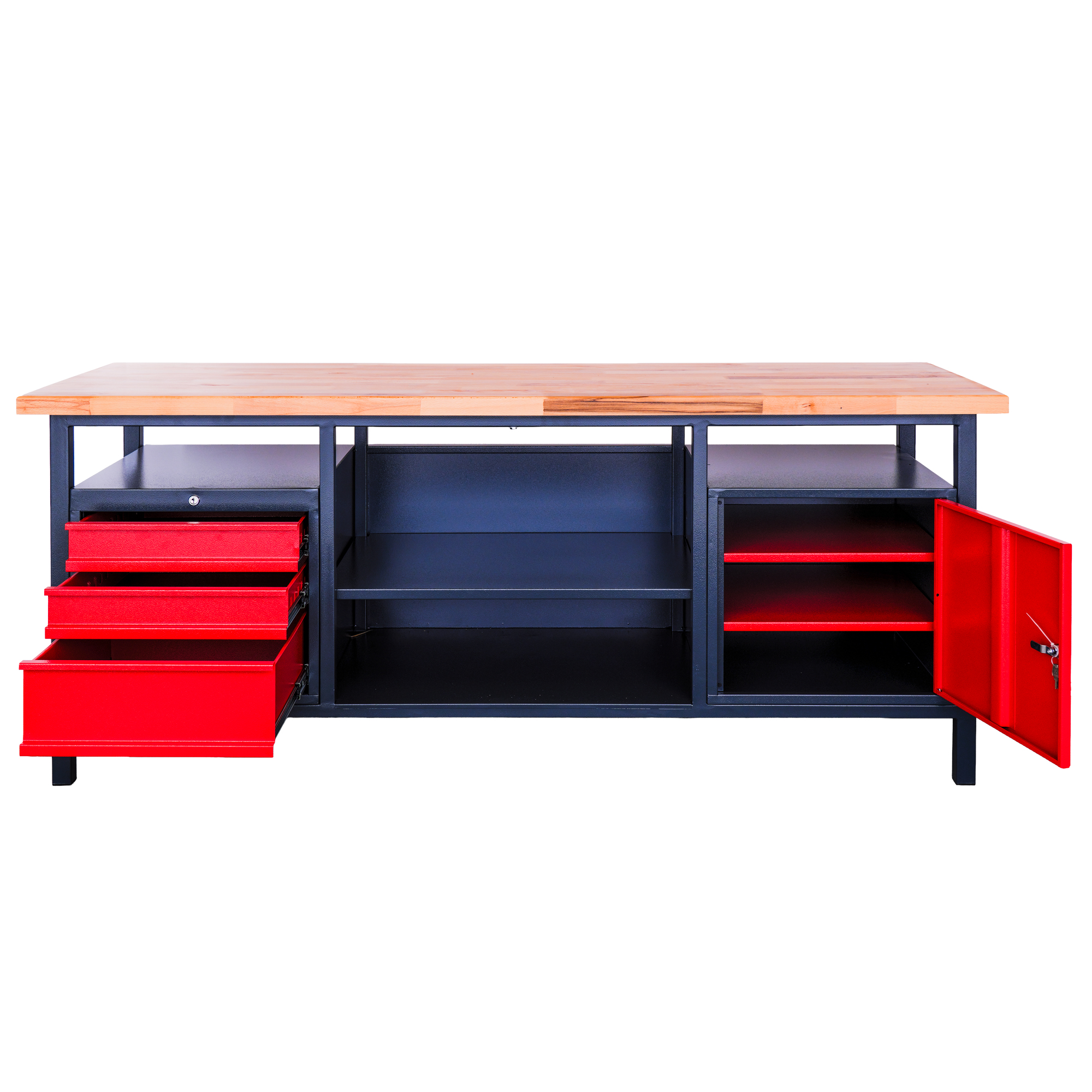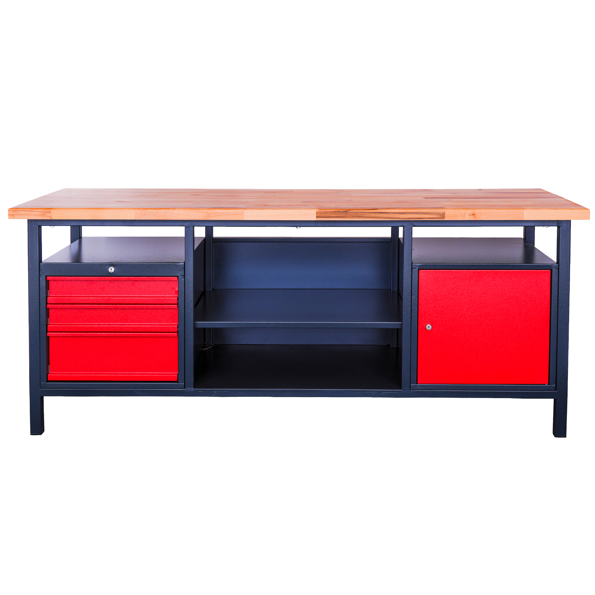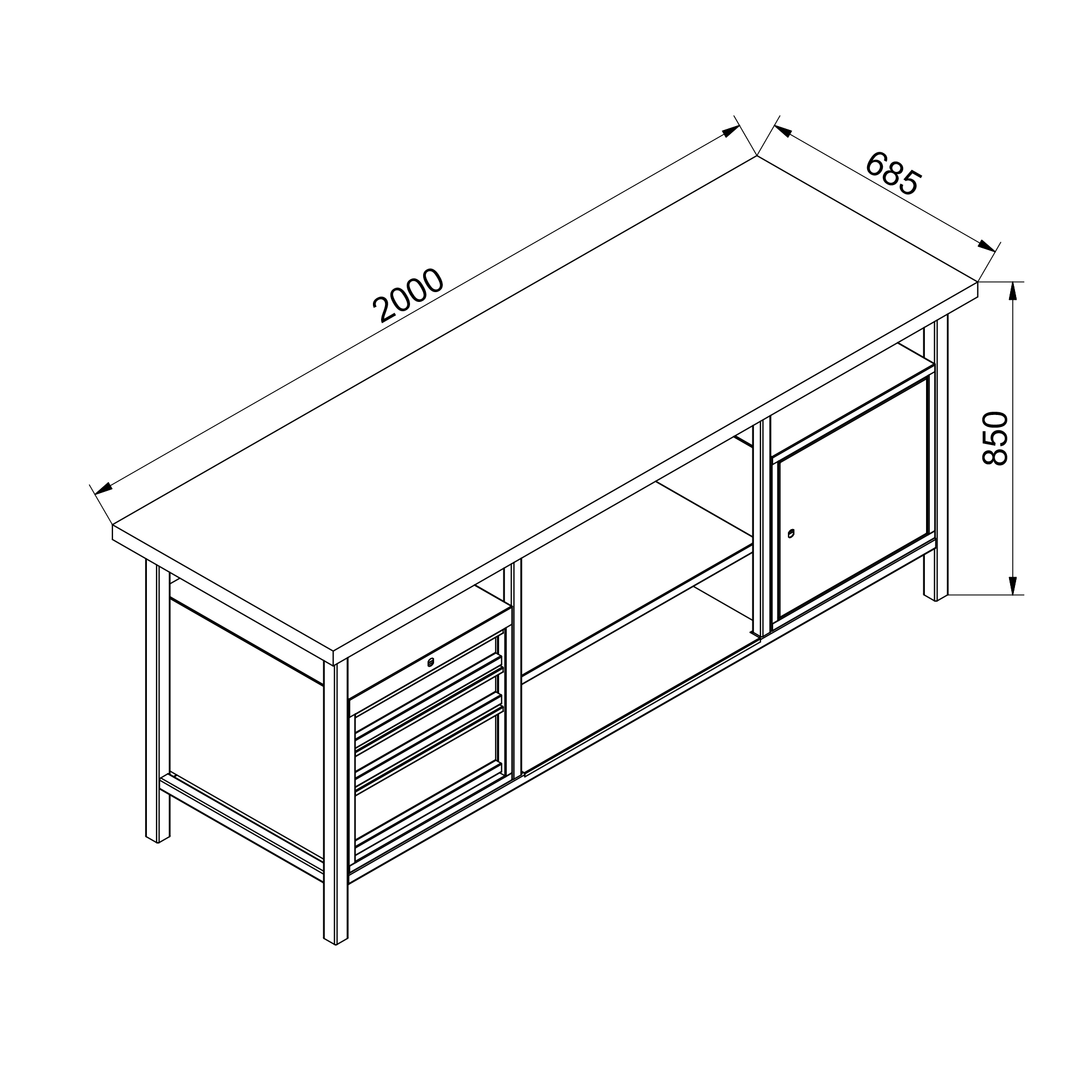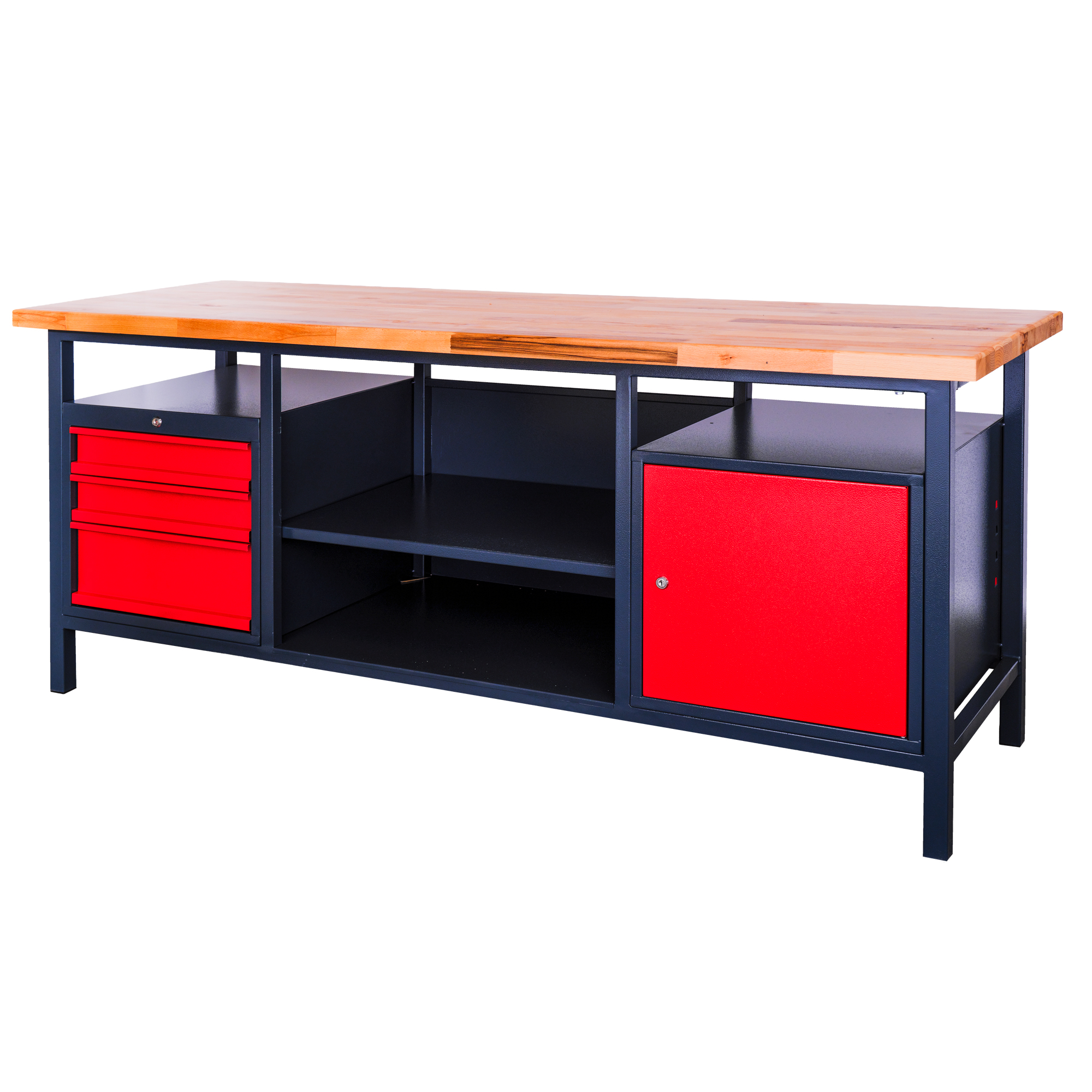 Kovový dielenský pracovný stôl so zásuvkami, policou a skrinkou, 2000 mm-01